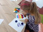 Діти створювали свій неповторний малюнок на тему "Повітряна куля". Дана техніка сприяла розвитку моторики рук, вираженню емоцій, зниженню стресу та гармонізації внутрішнього стану у дітей. Також тактильні відчуття від фарб мали заспокійливий ефект на нервову систему. Діти охоче використовували різноманітні кольори та з цікавістю малювали пальчиковими фарбами.